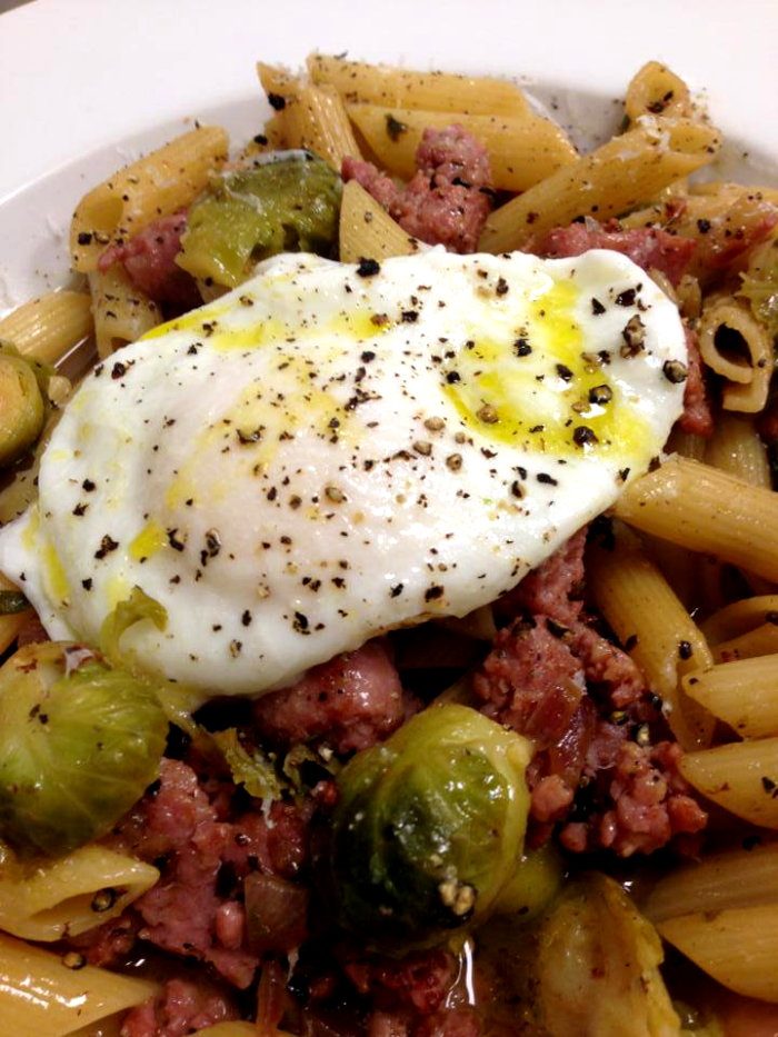 Penne Sausage, Brussels Sprouts, & Poached Egg drizzled with EVOO