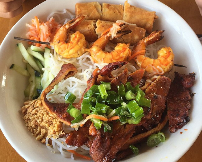 Grilled Pawns, Pork & Egg Rolls over Vermicelli Bowl