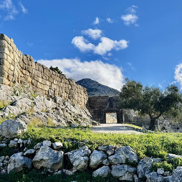 | The most famous feature of Mycenae, the Lion Gate dates to around 1250 BCE. It is named for the relief sculpture of two lions or lionesses flanking a column above the entrance. It served as the main entrance to the citadel and is a masterpiece of Mycenaean architecture. Grave Circles A and B are burial sites containing shaft graves that have yielded some of the most significant finds from Mycenae, including gold masks, weapons, and jewelry. The Mask of Agamemnon, a gold funeral mask discovered by Heinrich Schliemann, is one of the most iconic artifacts, though its attribution to Agamemnon is debated. At the heart of the citadel lies the Mycenaean palace, characterized by a central megaron, frescoed walls, and storerooms. The palace served as the administrative and ceremonial hub. The massive stone walls surrounding the citadel are known as Cyclopean because later Greeks believed they were built by the Cyclopes due to their size and the technical skill required to construct them. | |