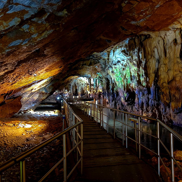 | The Aggitis River Cave, also known as the Maara Cave, is a stunning natural attraction located near the village of Aggitis in the Drama region of northern Greece. It is one of the longest river caves in the world and a significant geological and tourist site. The cave is approximately 21 kilometers long, though only a portion of it (about 500 meters) is accessible to visitors. | |