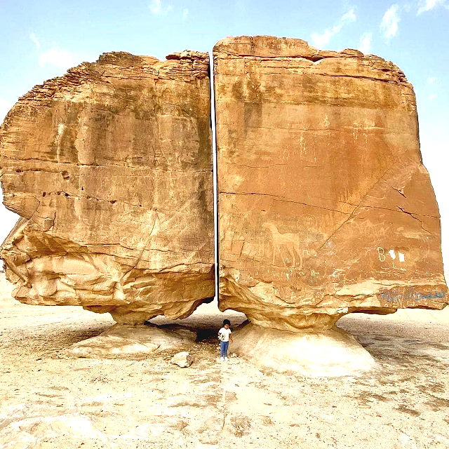 | The block is about 4 meters high and stands in a remote area surrounded by other rocks and formations. The exact cause of the split is not definitively known, and there are various theories. Some believe it is a result of natural geological processes, possibly due to stress and pressure over time leading to a clean break along a natural fracture line. Others have speculated about the involvement of human activities or ancient civilizations, although there is no concrete evidence to support such claims. Al Naslaa has attracted attention for its mysterious appearance, and it is sometimes considered a site of interest for those interested in geological formations and natural wonders. However, it's important to note that the scientific community generally leans towards natural explanations for the formation of such structures unless there is clear evidence to the contrary. | |
