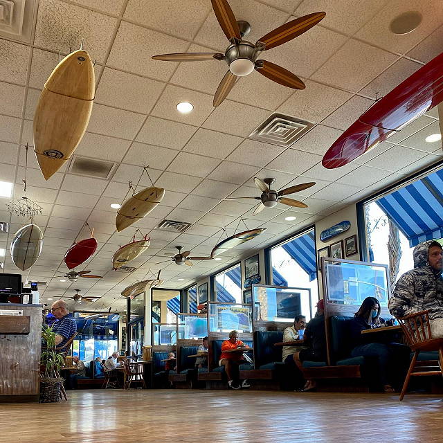 | Started in 1988, Beach Break Cafe has become a essential part of the Oceanside community. This surf-inspired diner serves American fare with a California twist. While dining they can check out the colorful surfboards, surfboard-inspired ceiling fan and surf photos. | |