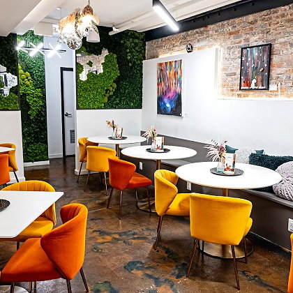 | Its vibrant and cozy space offers free public WIFI. It’s a perfect fit for remote workers and students. Our menu features a plethora of artisanal products by Blue's Coffee & Tea Co., traditional bites from the Philippines, like lumpia, charcuterie wine pairings, a plant-based, 'Mindful Indulgence" menu with a mediterranean twist and a variety of non-alcoholic beverages, ranging from spirit-free cocktails, botanical elixirs, craft NA beers, vegan wines and so much more. | |