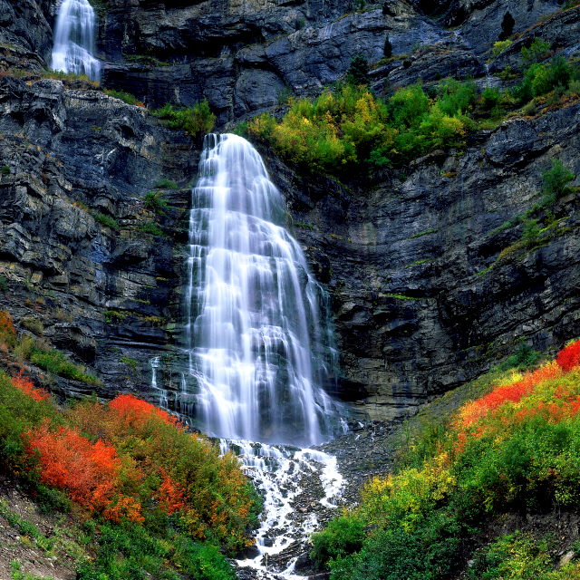 | Bridal Veil Falls is a 607-foot-tall (185 m) double cataract waterfall in the south end of scenic Provo Canyon. Bridal Veil Falls is easily accessible via a trail that connects to the parking lot. The trail to the falls is open year-round, although accessibility may be limited in the winter months due to snow. | |