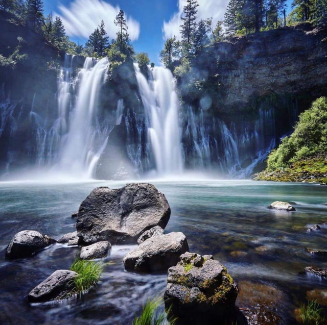 | Burney Falls is a waterfall located in McArthur-Burney Falls Memorial State Park in Shasta County, California, United States. The falls are approximately 129 feet high and are fed by underground springs that flow at a rate of 100 million gallons per day, making it one of the most beautiful waterfalls in California. | |