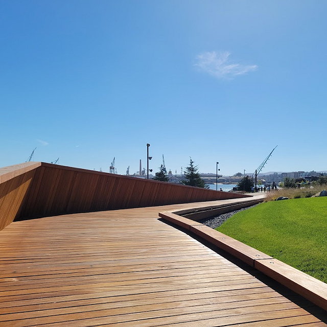 | Its layout includes open lawns, plazas, a section of the Bay Trail, and a boardwalk that extends toward the water like the prow of a ship. Rising 14.5 feet at its highest point, the park is built to withstand future sea level rise, making it not only a beautiful public space but also a climate-resilient one. Eventually the park will also be the home to a ferry landing to take people to and from Chase Center. | |