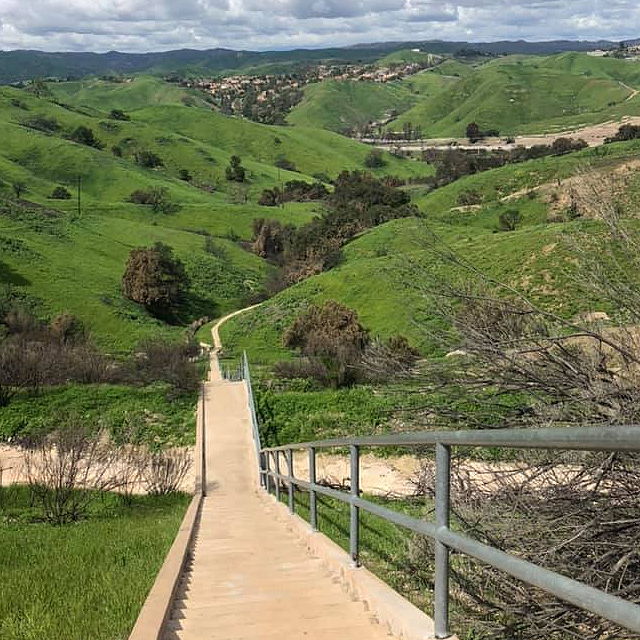 | Calabasas Stairs is a long, straight flight of 375 steps that climb a slope in the Santa Monica Mountains below a Calabasas neighborhood. It is a 0.6-mile hike from Calabasas Road (just off Highway 101) to the base of the steps. Venturing to the top of the steps and back to the road is 1.4 miles round trip with 330 feet of elevation change. | |