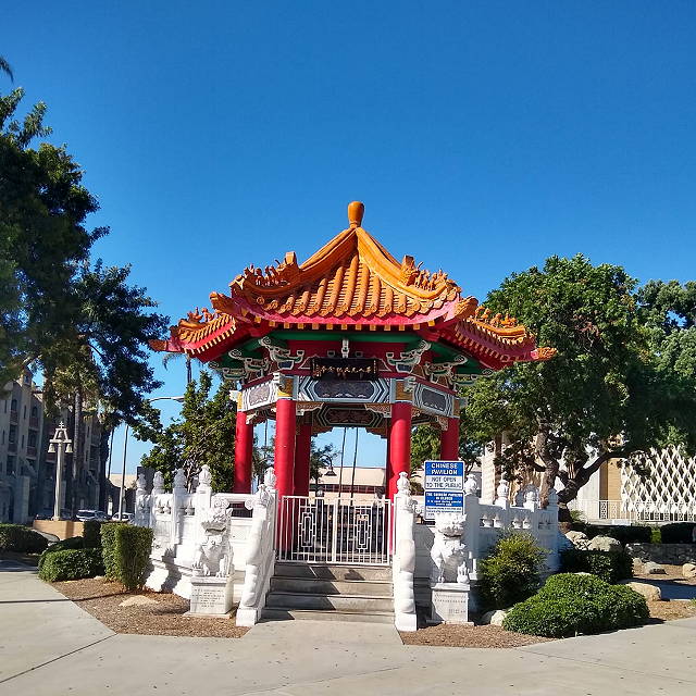 | The Chinese Pavilion was built in 1985-86 and stands in front of the Riverside Central Library, at the corner of Mission Inn Avenue and Orange Street. It was built in honor of the Chinese settlers who came to Riverside in the late 19th and early 20th centuries. | |