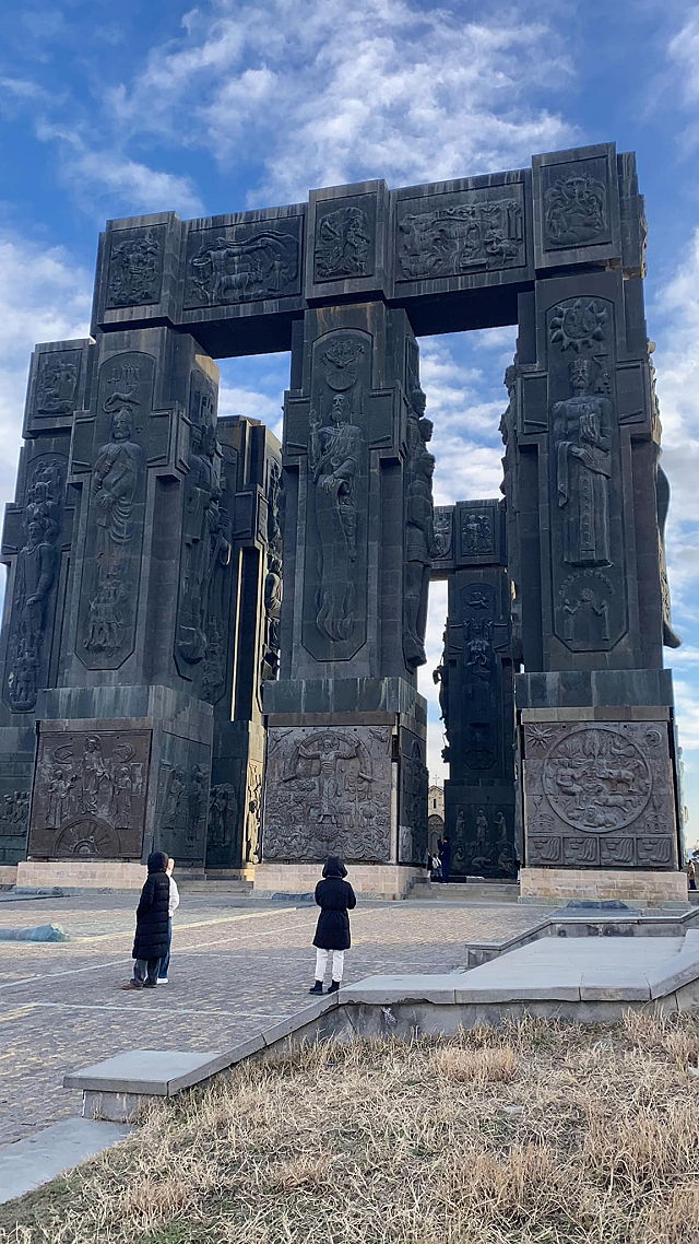 | The Chronicle of Georgia was erected in the late 1980s and early 1990s. It consists of massive stone pillars and depicts various scenes from Georgian history, mythology, and Christianity. The monument includes statues of prominent historical figures, kings, and religious symbols. The central pillar features a large cross with scenes from the life of Jesus. | |