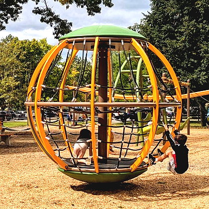 | Cook Park in Colonie, just outside of Albany, is a favorite among Capital Region families for the unique and ADA accessible playground structures. Structures include transferrable swings, ziplines, net climbers, a four-person seesaw, and more. There is a second, smaller playground in the park near the tennis and basketball court. | |