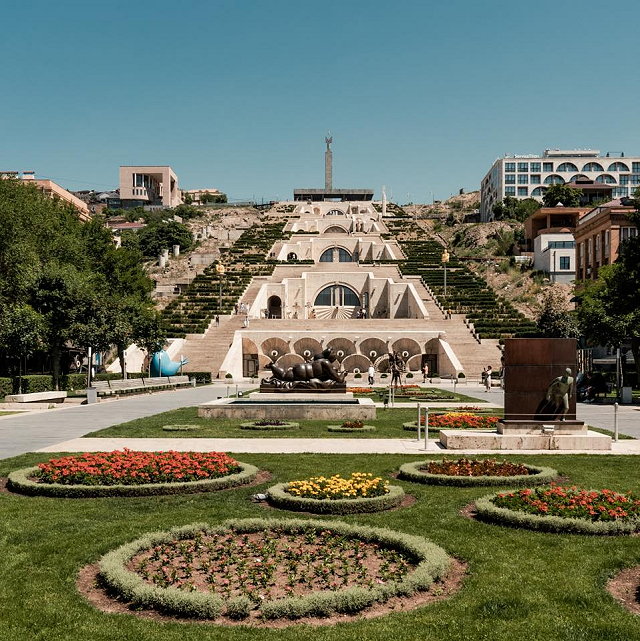 | The complex consists of a massive staircase with multiple levels, terraces, and cascading water fountains, symbolizing the flow and beauty of Armenian culture. The terraces offer breathtaking panoramic views of the city and Mount Ararat on clear days. The Cascade Complex is home to the Cafesjian Center for the Arts, founded by Gerard L. Cafesjian, an Armenian-American philanthropist. The center displays contemporary art, sculptures, and various works from Cafesjian’s collection. Both inside and outside the Cascade, visitors can view a variety of modern art sculptures and exhibits, making it a blend of urban design and artistic expression. - Exterior: The Cascade features 572 steps that lead from the base to the top, passing through gardens, fountains, and sculptures. - Interior: Inside, there are escalators that help visitors ascend to different levels, along with galleries and exhibition spaces showcasing rotating art collections. - Sculptures: The outdoor sculpture garden displays works by famous artists like Fernando Botero, Lynn Chadwick, and many more. | |