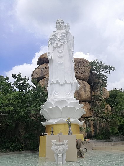 | The pagoda is built on a system of large and small stacked rocks, forming impressive natural caves. The landscape is described as "picturesque," with a stunning view of the sea, Cà Ná, and Cù Lao Câu island. The surrounding area features a sparse forest with beautiful wildflowers. The pagoda's structure is deeply integrated with its rocky environment. The largest cave serves as the main hall for worshiping the Tathagata Buddha (Phật Tổ Như Lai). Other caves house various altars for different deities. The main hall (chánh điện) is dedicated to worshipping Shakyamuni Buddha (Phật Thích Ca), Bodhisattva Avalokiteshvara (Phật Bà Quan Âm), and Tripitaka (Tam Tạng). There are smaller caves and a shrine for various deities, including Guan Yu (Quan Công). Notable statues include a large standing statue of Bodhisattva Avalokiteshvara in front and to the side of the pagoda, and another prominent statue of the Bodhisattva standing on a large rock halfway up the mountain. | |