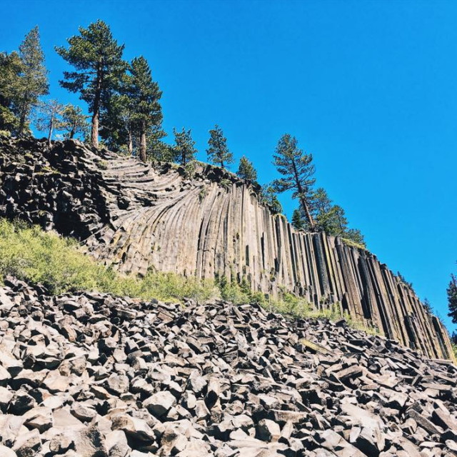 | This unique geological structure features thousands of hexagonal basalt columns formed 100,000 years ago when lava flow slowed and then cooled and cracked. The area is accessible in summer months, and a mandatory shuttle offers visitors transportation to Devils Postpile and other Reds Meadow areas. Catch the shuttle from the Mammoth Adventure Center at Mammoth Mountain Main Lodge. | |