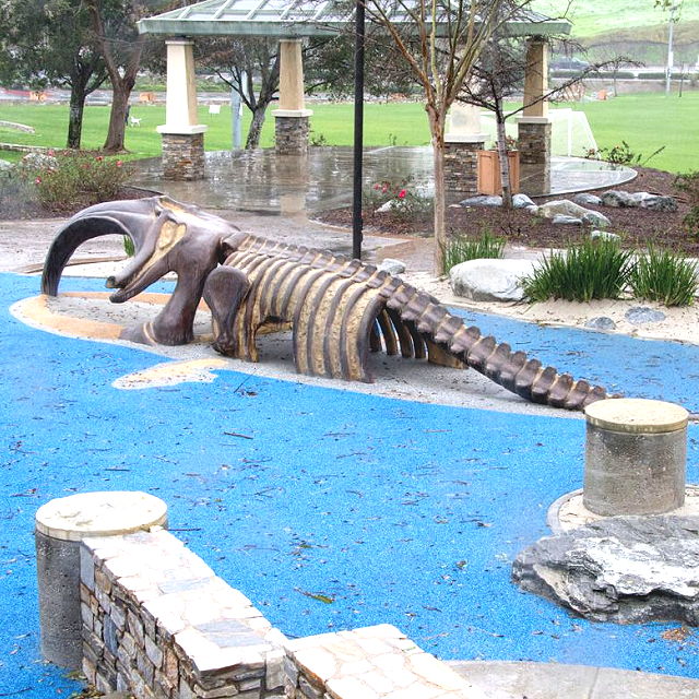 | A replica of fossil reef has been recreated by the playground bridge and has imprints of actual fossils that are over 15 million years old. Under the bridge, a 70 million year old fossil replica of a Hadrosaur is imbedded into the bridge wall, along with fossil pieces of a saber toothed cat, duck-billed dinosaur and mammoths. The prehistoric playground contains fossils - real and replicas - that represent a rich diversity of ancient life from the changing Laguna Hills environments. To walk across the playground is to walk through time. By enjoying the many paleontological features located throughout the playground, visitors can discover the ancient life that walked, swam, and flew thousands of years ago in the Saddleback Valley. | |