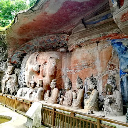 | The Dazu Rock Carvings consists of 75 cave temple sites, including more than 50,000 statues, being protected for their historical, artistic, and scientific values at different levels, representing the pinnacle of Chinese cave temple art between the 9th and 13th centuries. Among them, rock carvings of Baodingshan, Beishan, Nanshan, Shimenshan, and Shizhuanshan are exquisitely sculpted with the most distinctive style. | |