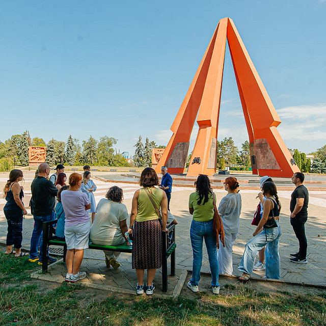 | The complex features a towering central obelisk with five massive granite bayonets symbolizing the unity and strength of the soldiers, as well as an eternal flame representing remembrance. Surrounding the obelisk are several sculptures and installations, including inscriptions, walls, and statues commemorating soldiers from different divisions and recognizing Moldova's role in the war effort. The site is often visited during Victory Day - May 9, when ceremonies and commemorative events are held, drawing veterans, locals, and tourists. The Eternity Memorial Complex stands as a reminder of the sacrifices made and Moldova’s enduring respect for its history. | |