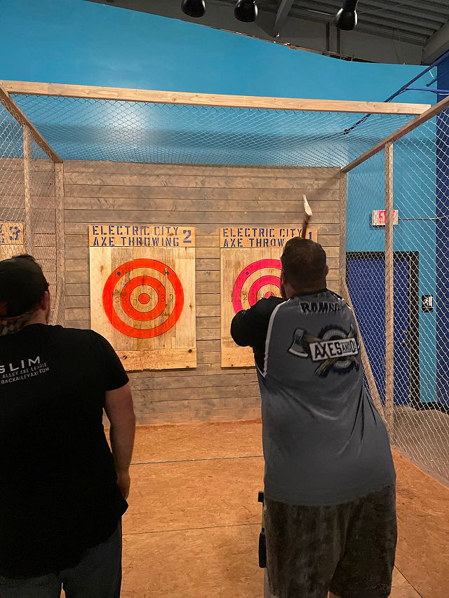 | - Axe Throwing Lanes: The venue features multiple lanes where participants can safely throw axes at wooden targets. Each lane is equipped with safety measures and trained staff to ensure a fun and secure experience for all participants. - Instruction and Guidance: Whether you're a beginner or an experienced axe thrower, Electric City Axe Throwing provides instruction and guidance to help you improve your skills and safely enjoy the activity. Staff members are on hand to offer tips, techniques, and assistance as needed. - Group Events: Electric City Axe Throwing is a popular destination for group events, such as birthday parties, corporate outings, bachelor/bachelorette parties, and team-building activities. The venue offers packages tailored to accommodate various group sizes and preferences. - Friendly Competition: Axe throwing at Electric City Axe Throwing is often structured as a friendly competition, with participants competing against each other or in teams to score points by hitting specific targets on the wooden boards. - BYOB: Some axe throwing venues, including Electric City Axe Throwing, allow participants to bring their own beverages (BYOB), adding to the social and relaxed atmosphere of the experience. However, it's essential to adhere to any policies or regulations regarding alcohol consumption on the premises. - Safety First: Safety is a top priority at Electric City Axe Throwing. The venue implements strict safety protocols, including providing safety briefings, enforcing rules and guidelines, and ensuring the proper maintenance of equipment and facilities. Overall, Electric City Axe Throwing offers a fun and exhilarating activity for individuals, groups, and parties looking for a memorable experience in Scranton, Pennsylvania. It combines the thrill of competition with the satisfaction of mastering a new skill in a safe and controlled environment. | |