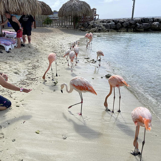 | - Flamingos: The beach is famous for its pink flamingos, which roam freely on the island. Visitors have the opportunity to get up close and personal with these elegant birds, making it a unique and memorable experience. - Access: While Renaissance Island is primarily for guests of the Renaissance Aruba Resort, there may be limited opportunities for non-guests to access the island. Day passes may be available, but availability can vary, and it's advisable to check with the resort directly for the most current information. - White Sand Beach: Flamingo Beach boasts pristine white sand and crystal-clear turquoise waters, providing a serene and relaxing environment for visitors. - Amenities: The island offers various amenities, including beachside service, restaurants, and water sports activities. - Photography: The flamingos and the scenic beauty of Flamingo Beach make it a popular spot for photography. Many visitors capture stunning images of the flamingos against the backdrop of the Caribbean Sea. | |