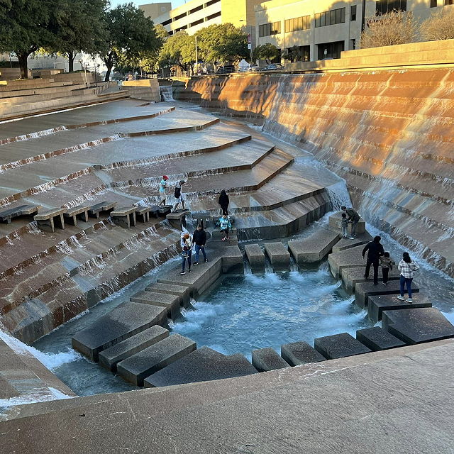 | Aerated Water Pool: This pool is known for its dynamic, aerated water that shoots up in multiple, changing patterns. Visitors can walk down steps into the pool area and experience the refreshing mist created by the aerated water. Quiet Water Pool: The Quiet Water Pool is a large, shallow pool with a flat surface of water. It provides a calm and reflective space, surrounded by planters and seating areas. Active Water Pool: The Active Water Pool features a series of terraced steps with water cascading down them. It creates a soothing sound and a visually appealing display. Visitors can walk down the steps and experience the flowing water up close. The Mountain: The Mountain is a tall, man-made structure with water cascading down its sides. It offers a visually striking element to the park and provides a unique backdrop. Accessibility: The Water Gardens are easily accessible, and entry is free. The park is open to the public, allowing visitors to enjoy the serene atmosphere and beautiful water features. Events and Photography: The Fort Worth Water Gardens is a popular location for events, photography sessions, and relaxation. It has been featured in various films and television productions due to its distinctive design. Safety Measures: While the water features are beautiful, visitors should exercise caution, especially around the Active Water Pool. The park includes safety measures, and it's important for visitors to be mindful of signs and guidelines. Adjacent Areas: The Water Gardens are located near other attractions in downtown Fort Worth, making it convenient for visitors to explore the surrounding area. | |