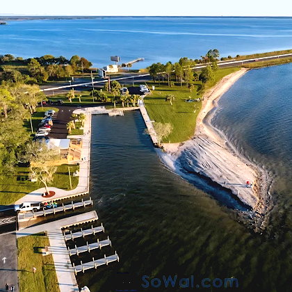 | Grady Brown Park is located north of the bay, near the Clyde B. Wells Bridge on US Highway 331, Freeport, Florida. The park features a sandy beach along Choctawhatchee Bay, two marinas and three finger-shaped jetties, picnic tables and chairs, barbecue grills, and a boat washdown station. | |