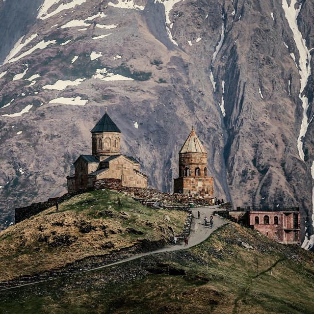 | - Location: The church is situated in the Greater Caucasus Mountains, near the town of Stepantsminda -formerly known as Kazbegi- in the Mtskheta-Mtianeti region of Georgia. It's perched on a hill at an elevation of approximately 2,170 meters (7,120 feet) above sea level. - Scenic Setting: Gergeti Trinity Church is celebrated for its stunning and dramatic location, nestled against the backdrop of the snow-capped Mount Kazbek, one of the highest peaks in the Caucasus Range. The combination of the church, mountains, and surrounding landscapes makes it a picturesque destination. - History: The church was built in the 14th century and is an important religious site in Georgia. It was constructed during a time when the region was threatened by invasions, and its elevated position made it a strategic location for defense. - Architecture: The architectural style of Gergeti Trinity Church is characteristic of medieval Georgian ecclesiastical buildings. It features a simple design with a central dome and cross-shaped plan, and it is constructed using traditional stone masonry. - Religious Significance: The church remains an active place of worship in the Georgian Orthodox Christian tradition. Pilgrims and visitors come to the site to attend religious services and to pay their respects. - Hiking and Trekking: The journey to Gergeti Trinity Church often involves a hike or a four-wheel-drive vehicle ride. There are hiking trails and paths leading to the church, providing an opportunity to enjoy the natural beauty of the region. - Photography: The church and its surroundings offer excellent photography opportunities, especially during different times of the day when the light and the mountain scenery create stunning visual contrasts. - Access: Gergeti Trinity Church is accessible from the nearby town of Stepantsminda by a road that leads to a parking area. From there, visitors can hike the remaining distance to the church. Gergeti Trinity Church is not only a place of religious significance but also a cultural and natural landmark in Georgia. It is a destination that offers a mix of spirituality, history, and awe-inspiring mountain scenery, making it a must-visit for travelers exploring the northern reaches of the country. | |