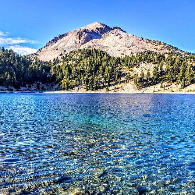 | - Over 100 feet deep, this alpine lake can hold snow and ice well into the summer months. On calm days, its crystal clear waters offers a near-perfect reflection of the snow-capped Lassen Peak. - The lake is clearly visible from a mile-long stretch of the park highway between the parking areas for Bumpass Hell and Lassen Peak Trails. | |
