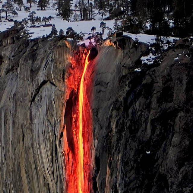 | Horsetail Falls is best known for its "firefall" effect, which occurs when the setting sun illuminates the waterfall and gives it a fiery appearance. This phenomenon only occurs for a few days each year in mid- to late-February, when the sun's angle is just right to reflect off the waterfall and create the illusion of fire. During the "firefall" event, the waterfall attracts thousands of visitors who come to witness the stunning display. Many visitors gather at the designated viewing areas near El Capitan Picnic Area and Yosemite Valley Lodge to watch the sunset and see the waterfall light up in shades of orange and red. Outside of the "firefall" event, Horsetail Falls is still a popular destination for hikers and nature lovers. There are several hiking trails in the area that provide stunning views of the waterfall and the surrounding landscape, including the Horsetail Falls Trail, which is a short, steep hike that leads to the base of the waterfall. For a few weeks in February, if the water is flowing in Horsetail Fall, photographers and park visitors gather in the waning evening light for an amazing natural display. The Horsetail Fall phenomenon appears when the angle of the setting sun sets the waterfall ablaze with reds and oranges, like a fire was falling down the cliffs on the shoulder of El Capitan. Where: Horsetail Falls is located in Yosemite Valley and is easily accessible by car or shuttle bus. The best time to visit is during the winter and spring months, when the waterfall is at its peak flow and the "firefall" effect is most likely to occur. The most convenient, and frequently shot view of Horsetail Fall is at the El Capitan picnic area, approximately 1.7 miles past Yosemite Lodge at the Falls on Northside Drive. In late February, you’ll often see rows of photographers of all levels there catching the last rays of light in the evening. | |