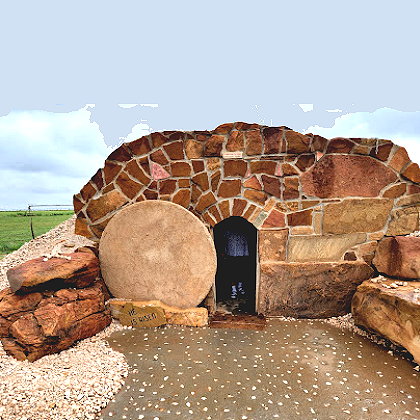 | Jesus Tomb Replica is on the north side of US-82/380, about 2–4 miles west of Brownfield. It’s a stone replica of the tomb of Jesus, complete with a “rolled-away” round stone. There is also a large white cross nearby. Inside the tomb there’s a peaceful space, and there’s a visitors log. | |