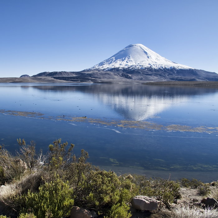 | Lauca National Park is located in Chile's far north, in the Andean range. It encompasses an area of 1,379 km2 of altiplano and mountains, the latter consisting mainly of enormous volcanoes. It is the snow-capped volcanoes, Pomerape and Parinacota. | |
