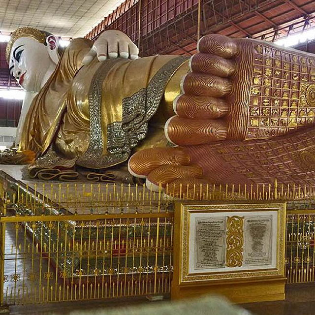 | The Buddha is adorned with vibrant colors, gold accents, and intricate detailing, particularly on the soles of his feet, which bear 108 sacred symbols representing aspects of Buddhist cosmology. Visitors can often see devotees making offerings and praying at the temple, enhancing its spiritual atmosphere. The Chaukhtatgyi Buddha Temple is located near other notable religious sites, including the Ngahtatgyi Buddha Temple, which features a large seated Buddha, making this area a rich cultural and religious destination in Yangon. | |