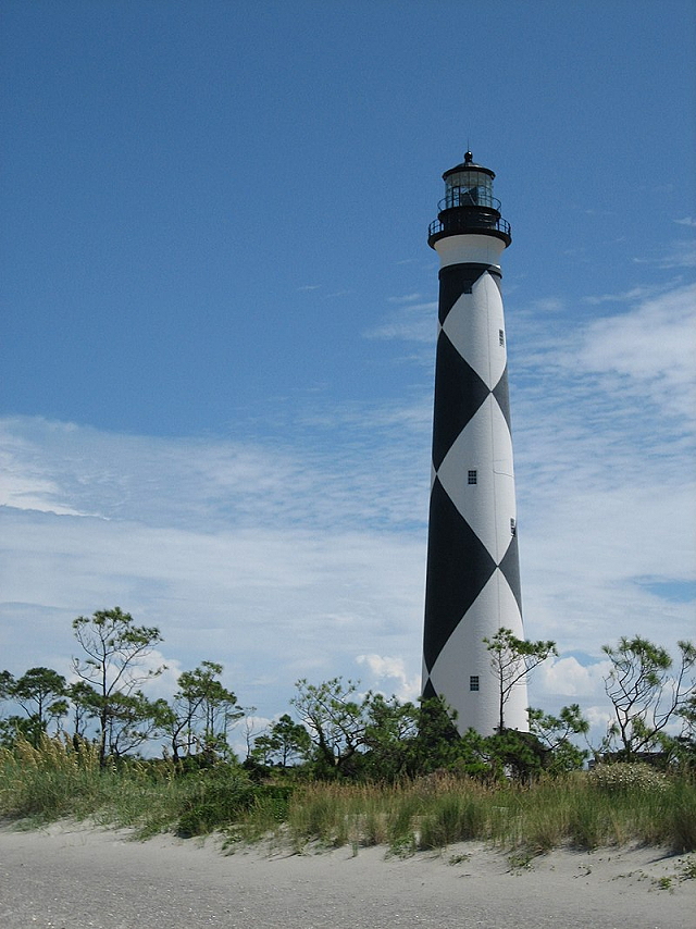 | The Cape Lookout Lighthouse is a 163-foot-high lighthouse located on the Southern Outer Banks of North Carolina. It flashes every 15 seconds and is visible at least 12 miles out to sea and up to 19 miles. | |