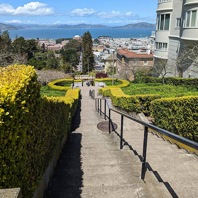 | The Lyon Street Steps are a great off the beaten path San Francisco attraction. They cover two blocks on the side of a steep hill with gorgeous views from the top. There are several things to love about these stairs. From the top, you will get amazing views of the Palace of Fine Arts, the blue waters of the SF Bay, and parts of Marin. | |