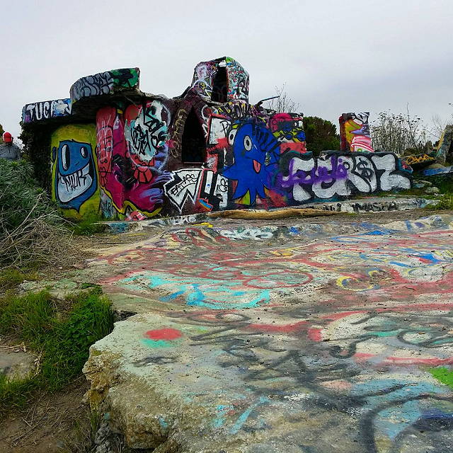 | Mad Mark’s Castle is a glorious achievement, a hand-built faerie castle made of scavenged rebar, concrete and plaster that stands proudly atop the Albany Bulb in San Francisco Bay, offering a fantastic view of the Golden Gate Bridge. | |