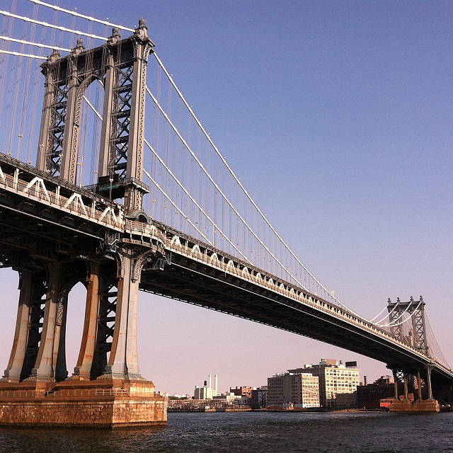 | The Manhattan Bridge connects Chinatown in Lower Manhattan and Downtown Brooklyn. The bridge supports seven lanes of vehicular traffic, four transit train lines, a pedestrian walkway and a separate bikeway. | |