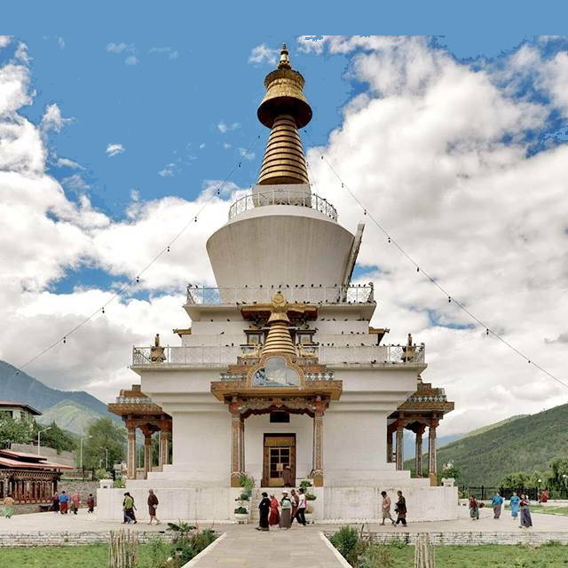 | The stupa is a prominent landmark in the city with its golden spires and bells. In 2008, it underwent extensive renovation. It is popularly known as "the most visible religious landmark in Bhutan". The stupa is a popular destination for both locals and tourists and is one of the most visible landmarks in Thimphu. It is decorated with intricate carvings and paintings that depict Buddhist teachings, and it is surrounded by a beautiful garden that is often filled with people performing circumambulations (walking around the stupa in a clockwise direction). The National Memorial Chorten is also a place of prayer and contemplation for many Bhutanese, who come here to offer prayers and offerings and to seek blessings for themselves and their loved ones. Inside the stupa, there are three floors, each with shrines and statues dedicated to different deities and Buddhist figures. The Chorten is open to visitors every day, but it is especially busy during religious festivals and on weekends, when many locals come to offer prayers and make offerings. Visitors are asked to dress modestly and to remove their shoes before entering the stupa. | |