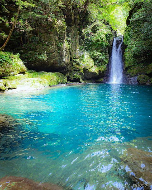 | This remote spot, located upstream on the Niyodo River, is considered one of the top spots to witness the surreal Niyodo Blue color of the river. Nikobuchi is the plunge pool of a short but powerful waterfall, and the water is so transparent that despite the churning of the falls you can still see every detail on the bottom of the pool. | |
