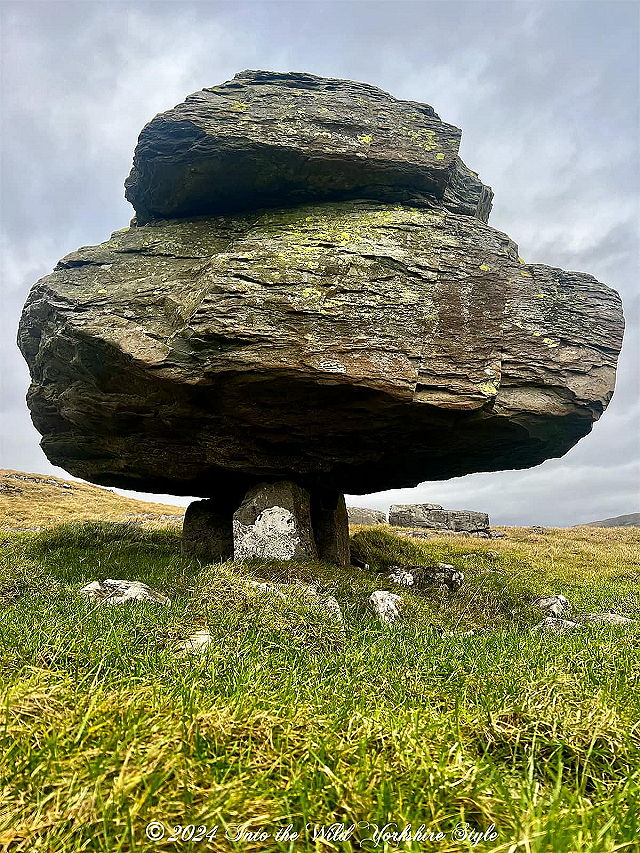 | Massive dark boulders of sandstone and slate, some of them precariously balanced on limestone plinths, are a spectacular sight and well worth a visit. | |