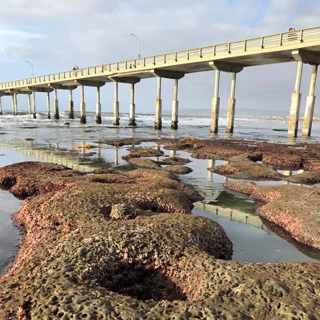 | If you’re in the eclectic Ocean Beach neighborhood during low tides, head over to the pier, where you’ll see lots of low-lying sandstone rocks where lots of sea life lives. This is actually a good San Diego tide pools spot for kids because the rocks are relatively flat with shallow pools. | |