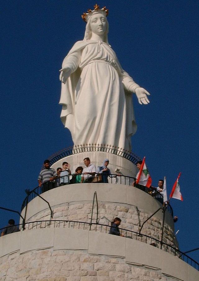 | The shrine is highlighted by a huge, 15-ton bronze statue. It is 8.5 m high, and has a diameter of five meters. The Virgin Mary stretches her hands towards Beirut. | |