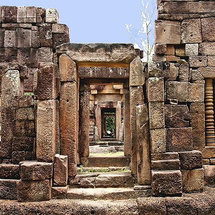 | Prasat Ta Muan Thom is part of a complex of three temples, which were important stops on the Ancient Khmer Highway that connected Angkor, the Khmer Empire's capital, to Phimai, a major administrative center (now in Thailand) . The other two temples in the group are Prasat Ta Muen Toch and Prasat Ta Muen. The temple was built between the 11th and 13th centuries by Udayadityavarman II and Jayavarman VII. It features a central square-shaped prang (tower) with a prominent projecting porch, constructed from laterite and sandstone. | |