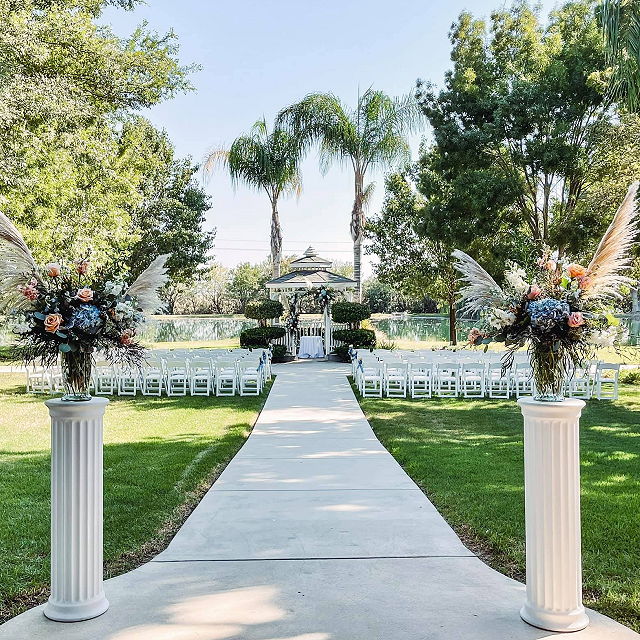 | Park Place is beautifully nestled among rows of almond trees. It has a peaceful lake that quietly rests next to an open lush garden area and spacious banquet hall. The signature water fountain in the center of the lake adds to the charm and serenity of the venue. | |