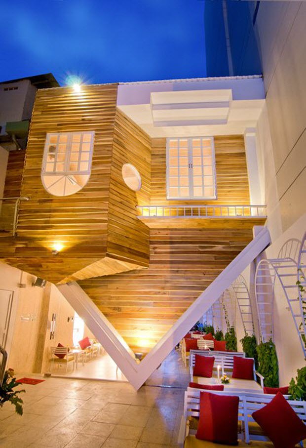| An upside-down Coffee Shop - Interior decorators are glued to the ceiling, from the long dining table, chairs, bookcases, cabinets and paintings, make you feel like you're floating on the ceiling. | |