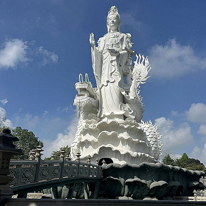 | The temple has a history spanning over a century. It was initially built around 1904 by the Venerable Thích Trí Lượng using simple materials like bamboo and leaves. Over the years, it has undergone several renovations and expansions, particularly in 1925 and 2007, to become the grand structure it is today. The temple showcases a unique blend of Eastern and Western architectural styles. Its main hall is covered with hooked roof tiles, and the main entrance is designed in the shape of a vaulted arch, reminiscent of a Christian church. This fusion of styles gives the temple a distinctive and captivating appearance. One of the most notable features of Chùa Gò Kén is its large statues. The temple grounds house a 25-meter-tall statue of Quan Âm Bồ Tát standing on a 7-meter-tall dragon, and a 25-meter-long statue of the Reclining Buddha. These statues are among the largest in the Southeast region of Vietnam and are significant attractions for visitors. Chùa Gò Kén is not only a place of worship but also a center for Buddhist cultural activities. It attracts numerous pilgrims and tourists who come to experience its serene environment and participate in various religious ceremonies. The temple played a crucial role in the early development of the Cao Đài religion. From October 1926 to January 1927, it served as the venue for the founding ceremonies of Cao Đài, a syncretic Vietnamese religious movement. | |