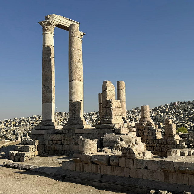 | - Massive Columns: The temple is distinguished by its large Corinthian columns, two of which remain standing today. These towering columns give a glimpse of the temple's grand scale and architectural elegance. - Hand of Hercules: A colossal stone hand, believed to be part of a massive statue of Hercules, is one of the most famous remnants found at the site. Scholars estimate that the original statue could have been over 12 meters tall. - Strategic Location: The temple is situated at the highest point of the Citadel, offering panoramic views of Amman and showcasing the importance of the site in ancient times. The Citadel itself is a multi-layered archaeological site, featuring remnants from various civilizations, including Roman, Byzantine, and early Islamic periods. - Blend of Cultures: The Temple of Hercules represents the Roman influence on the region, which was part of the Roman Empire's province of Arabia Petraea. The site blends Roman architectural styles with local elements. | |