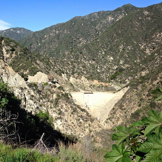 | Santa Anita Dam is a concrete thin arch dam on Santa Anita Creek in the San Gabriel Mountains of Los Angeles County, California. The dam is 225 feet (69 m) high and 612 feet (187 m) long, holding 858 acre-feet (1,058,000 m3) of water with a maximum capacity of 1,028 acreâ‹…ft (1,268,000 m3). | |