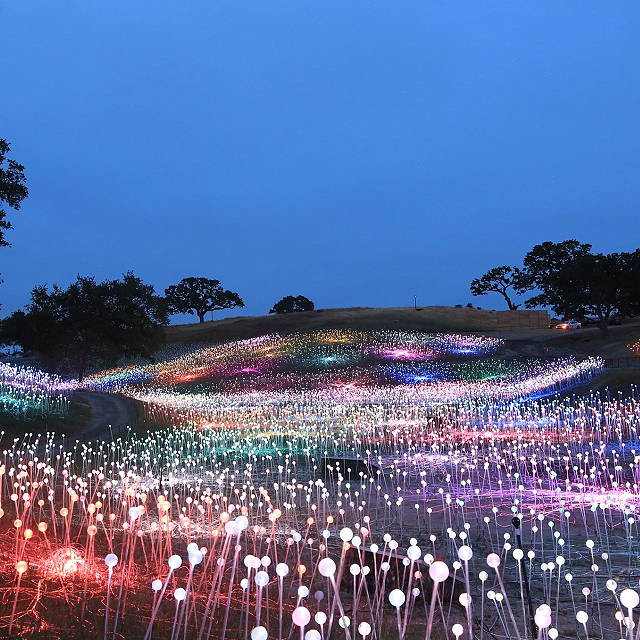 | - The centerpiece of Sensorio is the Field of Light, a massive art installation comprising over 58,800 stemmed fiber-optic spheres. These spheres gently illuminate the rolling hills with changing colors, creating a dreamlike and ethereal landscape. The installation is powered by solar energy, highlighting sustainability in art. - Another standout feature is the Light Towers, consisting of 69 towers built with over 17,000 wine bottles illuminated by fiber optics. These towers celebrate Paso Robles’ wine country heritage and shift in vibrant colors to synchronized musical compositions. | |
