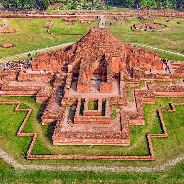 | - Construction: The monastery was built by the Pala Empire ruler Dharmapala in the 8th century. It is believed to have been constructed between 780 and 810 AD during the reign of the Pala dynasty. - Architectural Style: Somapura Mahavihara represents a mix of architectural styles, including Gupta and Pala styles. The complex follows the traditional layout of a Buddhist vihara, with a central courtyard surrounded by monastic cells. - Layout: The main structure of Somapura Mahavihara is a large quadrangular courtyard with a cruciform stupa in the center. The vihara complex includes 177 cells for monks arranged around the courtyard. The main entrance is on the northern side. - Stupa: The central stupa is a prominent feature of the complex, and it rises above the courtyard. The stupa is surrounded by a number of smaller stupas and shrines. - Inscriptions: Several inscriptions found at the site provide information about the construction and history of Somapura Mahavihara. The inscriptions are in Sanskrit and written in the early Bengali script. - Decline: Somapura Mahavihara declined over the centuries, and it is believed to have been abandoned by the 12th century. The site eventually fell into ruins and was rediscovered in the 19th century during British rule. - UNESCO World Heritage Site: Somapura Mahavihara was designated as a UNESCO World Heritage Site in 1985, recognizing its historical and cultural significance. Visitors to Somapura Mahavihara can explore the archaeological remains of the site, including the central stupa, monastic cells, and other structures that provide insights into the architectural and cultural heritage of ancient Bengal. The site stands as a testament to the rich history of Buddhism in the region and its contribution to learning and education during the Pala Empire. | |