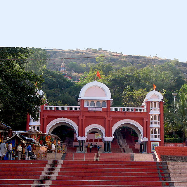 | The temple is believed to have been built during the reign of the Maratha king Shivaji. Approximately 250 years ago, a merchant named Durlabhsheth Pitambardas Mahajan, a devotee of Devi Saptashrungi, established the temple after the goddess appeared to him in a dream and directed him to a mountain in the north-west of Pune. The primary deity is Goddess Chattushringi, also known as Goddess Ambareshwari, who is considered the reigning deity of Pune35. She is also revered as Mahakalee, Mahalakshmee, and Mahasaraswatee. The temple is 90 feet high and 125 feet wide. The temple complex includes shrines dedicated to Goddess Durga and Lord Ganesh, as well as eight miniature idols of Ashtavinayaka located on separate hillocks. To reach the main shrine, devotees must climb more than 200 steps, with seating areas provided for rest. | |