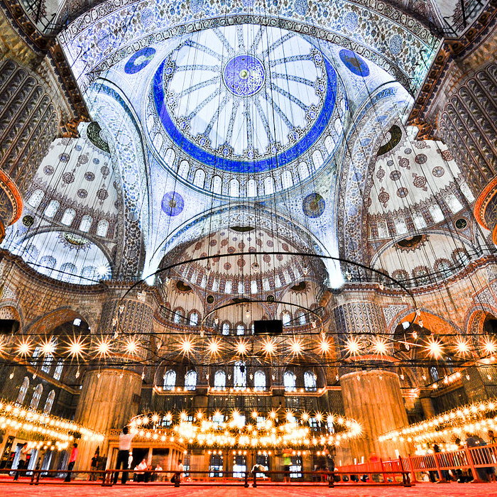 | The Blue Mosque is an historical mosque in Istanbul. The mosque is known as the Blue Mosque because of blue tiles surrounding the walls of interior design. Besides being tourist attraction, it's also a active mosque, so it's closed to non worshipers for a half hour or so during the five daily prayers. | |