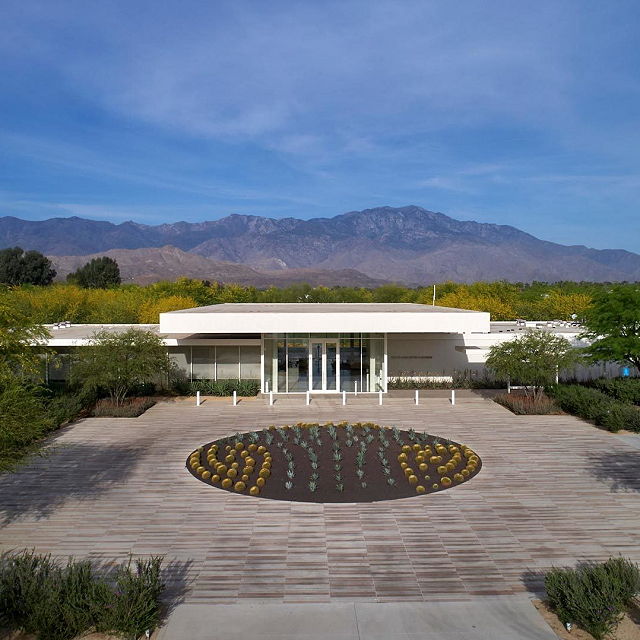 | Sunnylands Center & Gardens first opened to the public in March 2012. Upon entering the 15-acre site, a winding driveway takes visitors through a desert art garden to the glass facade of Sunnylands Center. The spacious, contemporary building houses a rotating art exhibition, café, gift shop, and multimedia offerings that detail the history of Sunnylands. | |